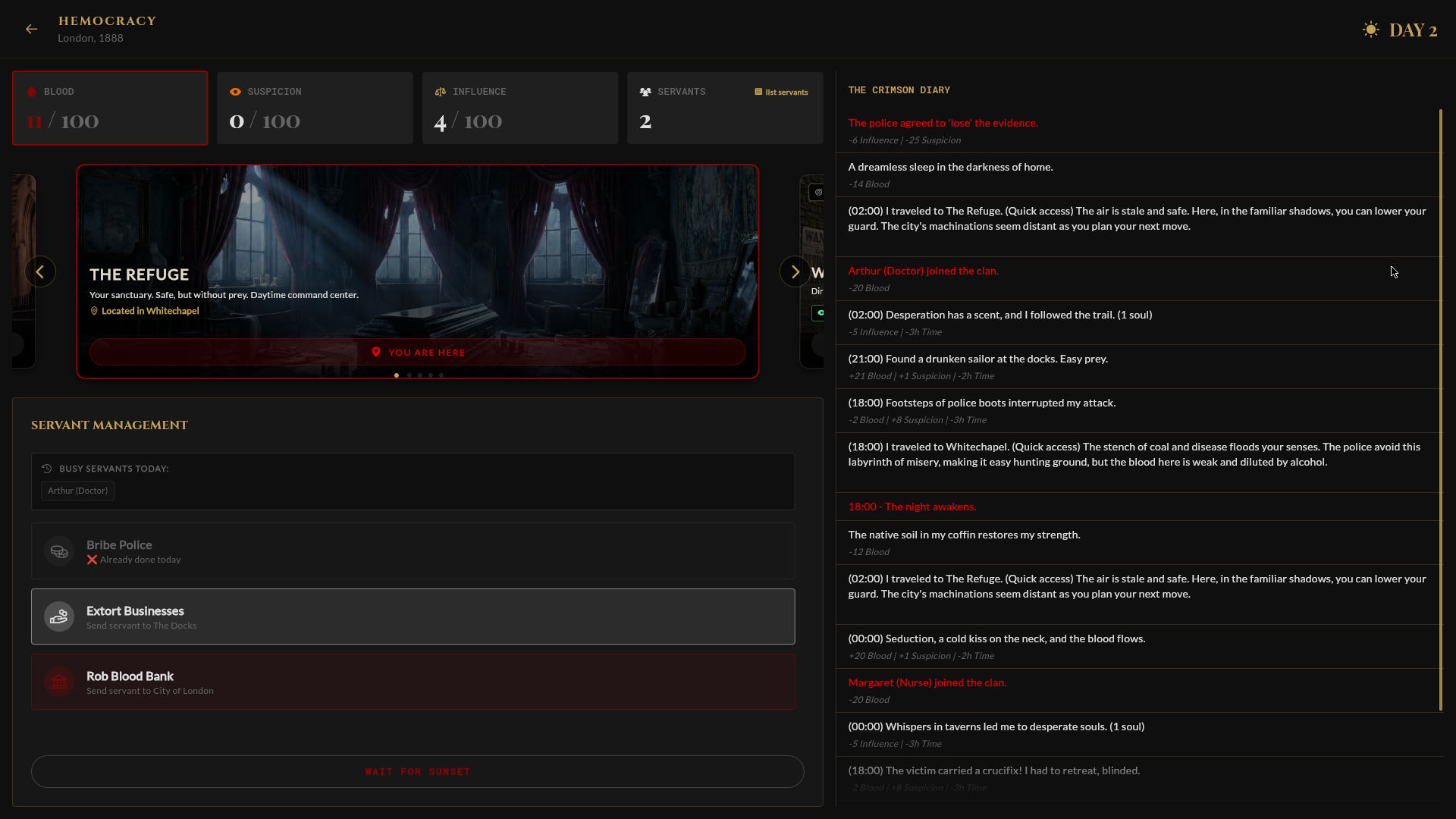 You control the vampire directly. Hunt prey, recruit servants, manipulate the elite, and travel between districts. But beware: actions take time, and being caught by sunrise deals Blood damage per hour in sunlight.