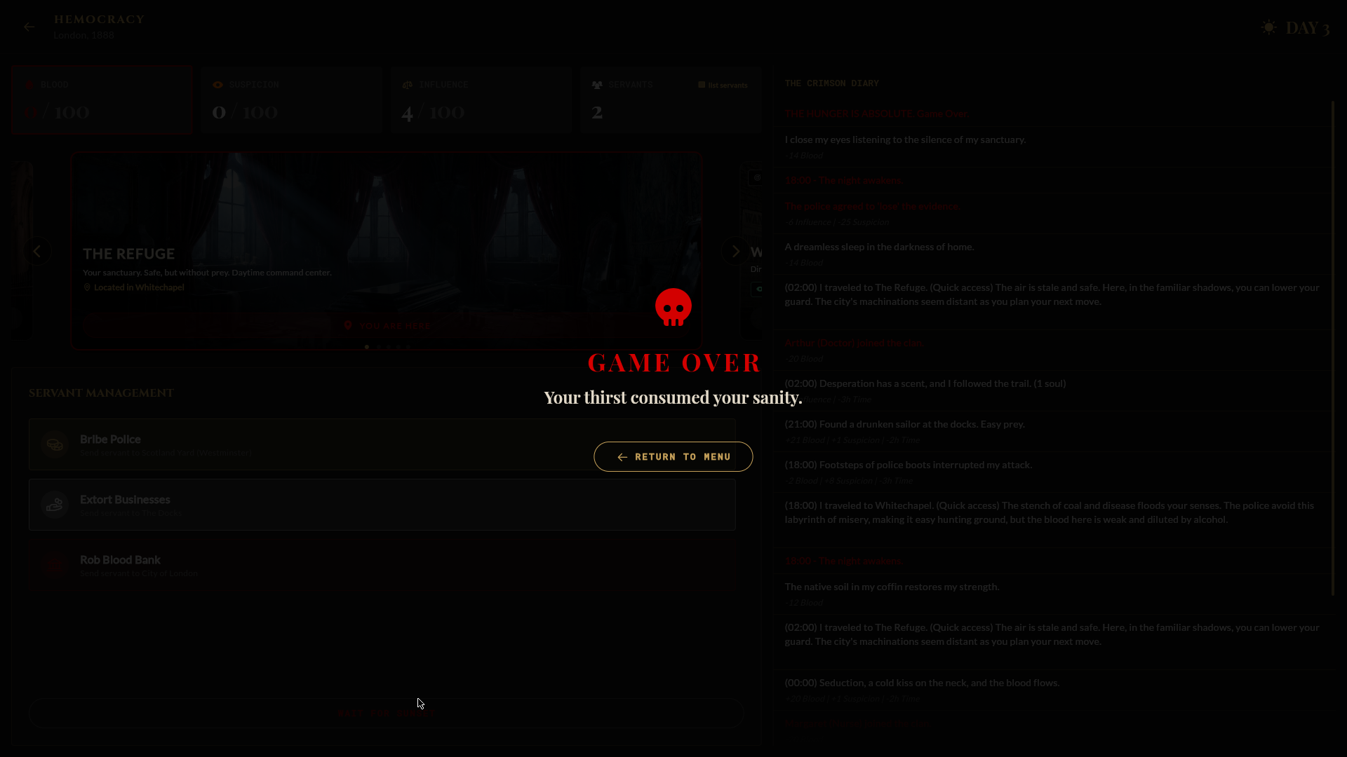 You are an ancient vampire who has just arrived in Victorian London, 1888. The Industrial Revolution roars above while darkness reigns below. Your goal: build a shadow empire across four districts and become the Prince of London.